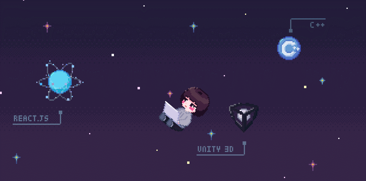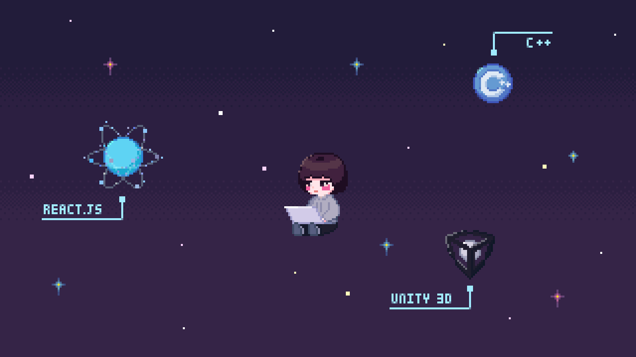 유니티 로고는 사실 전에 도트로 찍어둔 게 있어서 재탕했다. 입체를 표현한 로고이다 보니까 도트로 찍는데 고생이 많았어서 다시 찍고싶지 않았고 크기도 맞아서 그대로 썼다. 얘는 너무 각져서 어떻게 행성으로 표현할까 했는데 그냥 안에다가 조그만 행성을 하나 넣고 유니티 로고가 그걸 감싸고 있는 것처럼 표현했다. CSS 이동 애니메이션도 일부러 안에 행성이랑 겉에 로고에 딜레이를 좀 줬는데 티가 나나?