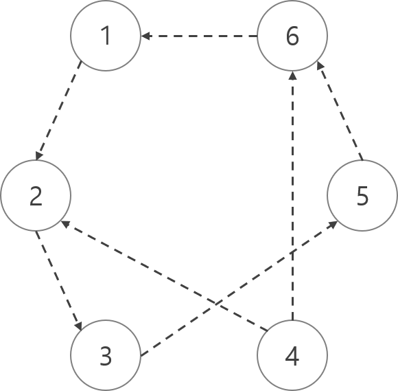 위와 같은 방향 그래프가 있다고 하자. 1번 노드에서 1번 이동하면 2번 노드로 가고, 1번 노드에서 10번 이동하면 다시 1번 노드로 온다. 이정도는 계산이 쉬운데, 만약 그래프나 쿼리 수가 엄청 커서, 193403번 노드에서 389734번 이동한 결과를 134178번 물어보면 조금 화가 날 것이다. 그럴 때 sparse table을 사용하면 좋다. 만약 i번 노드에서 k번 이동한 결과를 알고 싶을 경우에는 k = a0 * 2^n + a1 * 2^(n-1) + a2 * 2^(n-2) + ... + an * 2^0 (a0~an은 0 or 1)인 a0~an을 찾아서 계산해주면 된다.