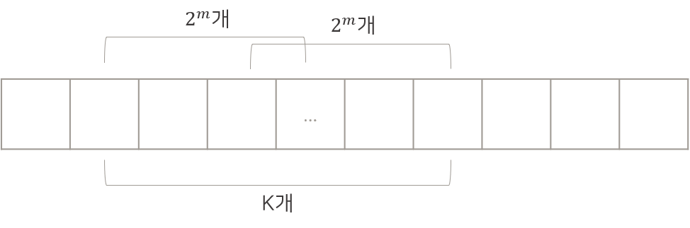 이렇게, K개 구간 중 최댓값은 i번부터 2^m개, j번부터 왼쪽으로 2^m개의 sparse table 값을 통해 알 수 있다. 이 때 m은 [밑이 2인 logK]이다.