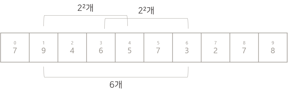 만약 2~7 구간의 합을 구하고 싶다면, 이는 2~5 구간의 합 + 6~7 구간의 합과 같으므로 d[2][2] + d[6][1]로 구할 수 있다.