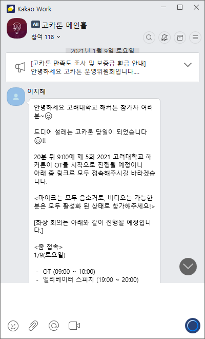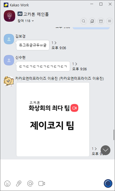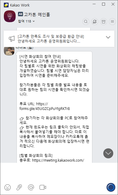 그러던 중 카카오워크에서 후원에 대한 긍정적인 답변을 해주셨고, 자연스럽게 카카오워크를 메인 플랫폼으로 이용하기로 가닥이 잡혔다. 게다가 화상 회의 기능도 있다!