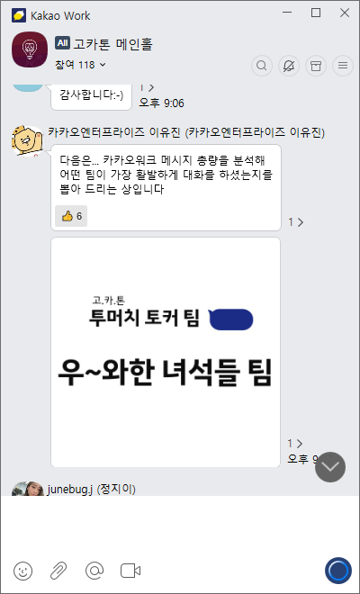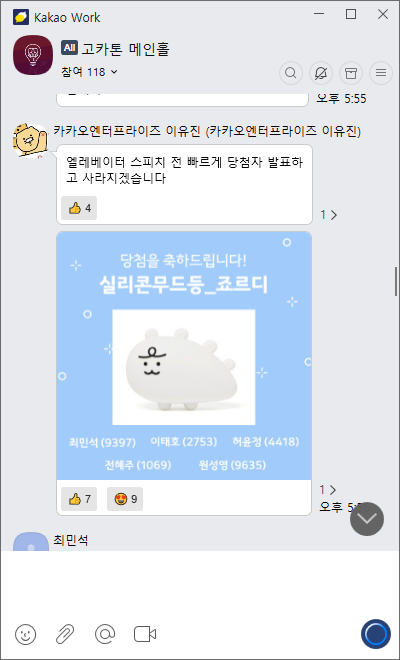 카카오워크 플랫폼 자체도 정말 유용하게 썼는데, 대회 중간중간 활기를 불어넣어주는 다양한 이벤트까지 준비해주셔서 정말 감사했다. (게다가 참가자분들께 전원 커피 기프티콘까지 쏘셨다!) 즐거운 행사 진행에 큰 도움 주셔서 진짜로 눈물이 났다. 헤헤ㅎ