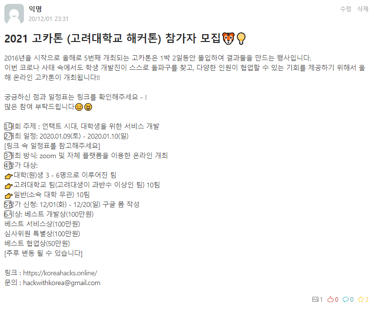 홍보는 에브리타임, 단톡방, 고파스, 페이스북 등 올릴 수 있는 곳이라면 다 올렸다. 다른 학교 지인들에게 열심히 부탁도 했다.