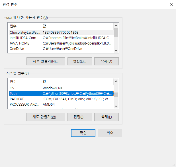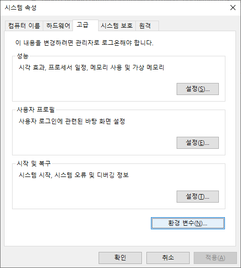 일단 윈도우에서 시스템 환경 변수 편집에서 환경 변수에 들어가면 환경 변수의 목록을 볼 수 있는데