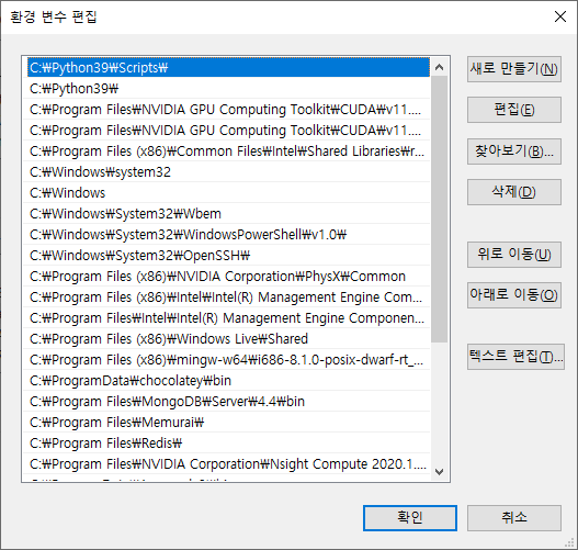 여기서 Path를 찾아서 편집을 누르면 이렇게 목록이 뜹니다. 귀찮으면 윈도우의 경우