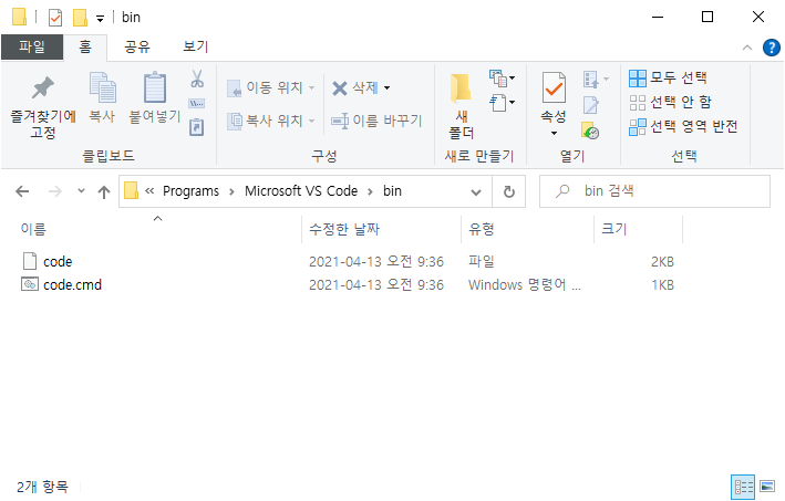 여기에 있는 code.cmd를 실행하면 VS Code가 켜집니다. 얘네가 code 명령어를 해석해서 VS Code를 열어주는 것 같습니다. 이제 code 명령어를 내 컴퓨터 어디서나 쓸 수 있도록 하기 위해서는 컴퓨터에 "code라는 명령어는 C:\Users\user\AppData\Local\Programs\Microsoft VS Code\bin 여기에 있어!" 라고 알려줘야 합니다. 저 경로를 환경 변수의 PATH에 추가해주는 게 바로 컴퓨터에 어디서 명령어를 검색할지 알려주는 행동인 겁니다.