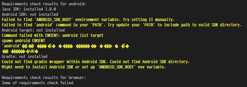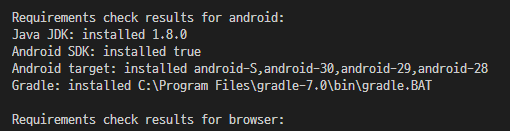 앱을 빌드하고 실행하기 위해서는 대상으로 할 각 플랫폼들의 SDK를 설치해야 합니다. (그리고 브라우저는 SDK가 필요 없습니다.) 플랫폼 빌드를 위한 요구 사항을 충족하는지 확인해볼 수 있습니다.