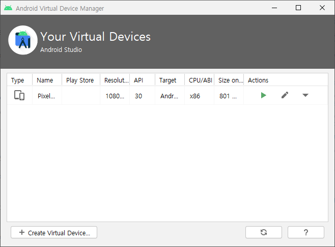 안드로이드 스튜디오 AVD 매니저에서 직접 켜야 하더라고요. 영감탱 가만안도