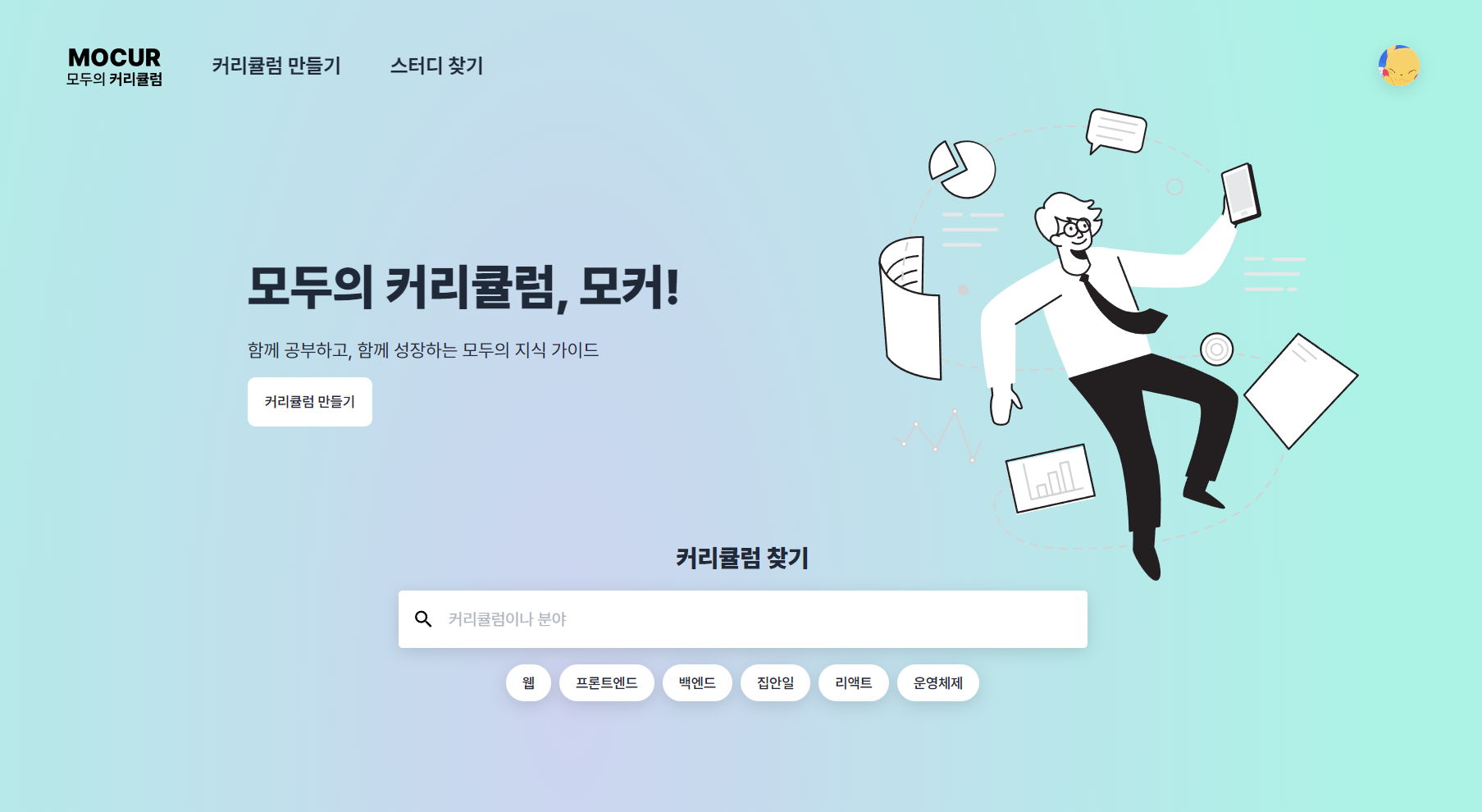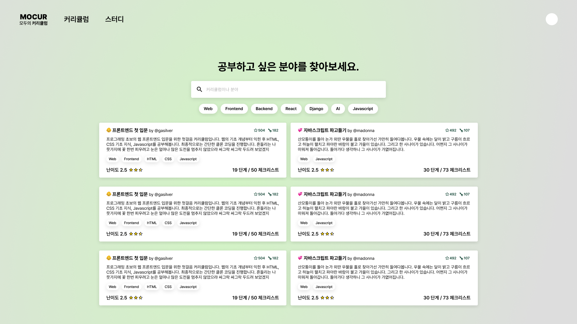 갑자기 청록색에 꽂혀서, 디자인을 청록색으로 했다고 생각했으나 제 노트북의 디스플레이 문제 때문에 의도했던 색이 아니었다는 것을 확인 후 색감이 대폭 수정된 모습.. 아무래도 서비스 설명은 있어야 할 것 같아서 기획 팀원분이 chatGPT로 생성해주신 슬로건들을 짜맞춰서 만들어낸 '함께 공부하고, 함께 성장하는 모두의 지식 가이드'라는 멘트. 맘에 들어요.