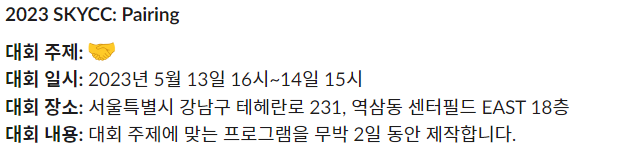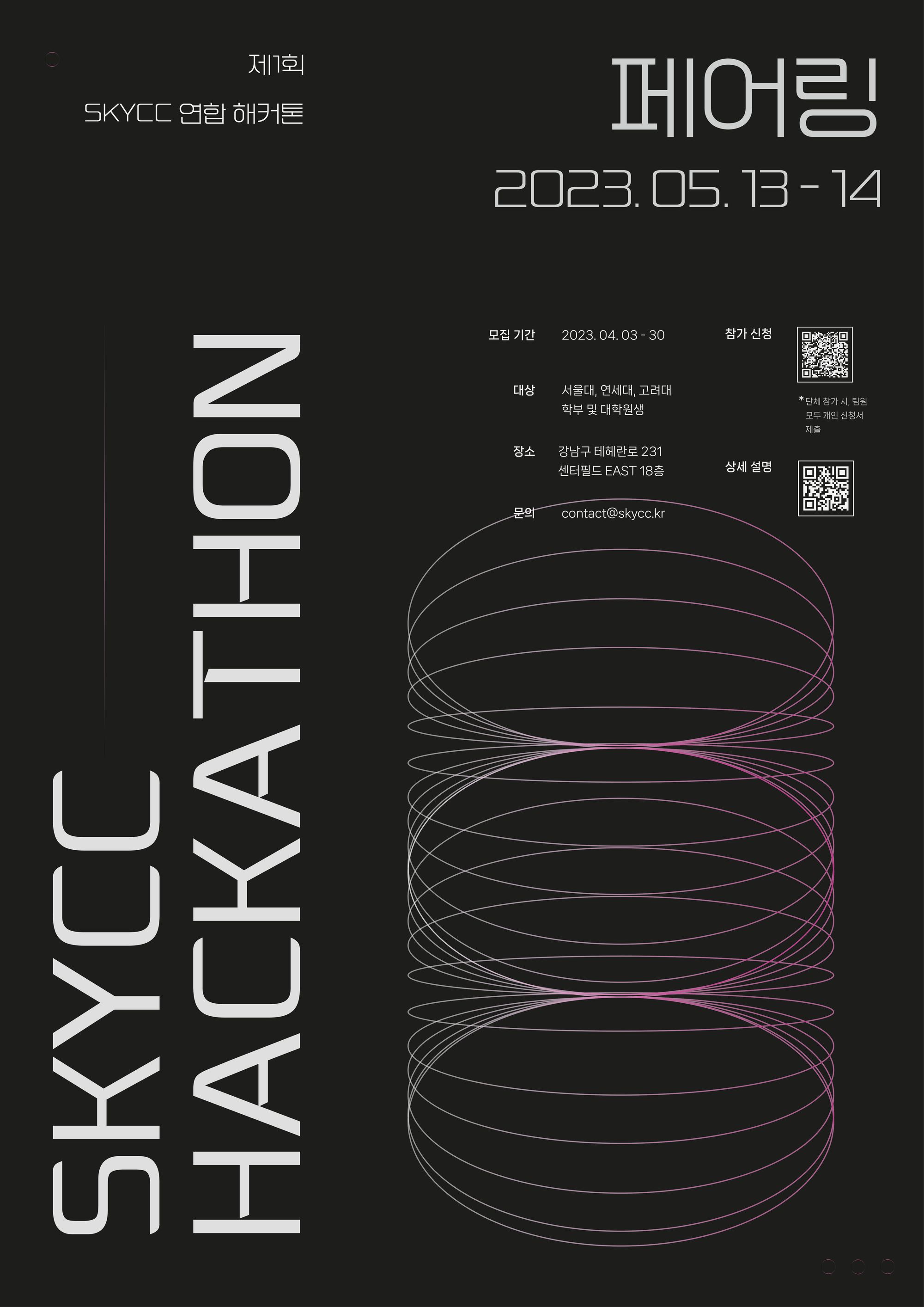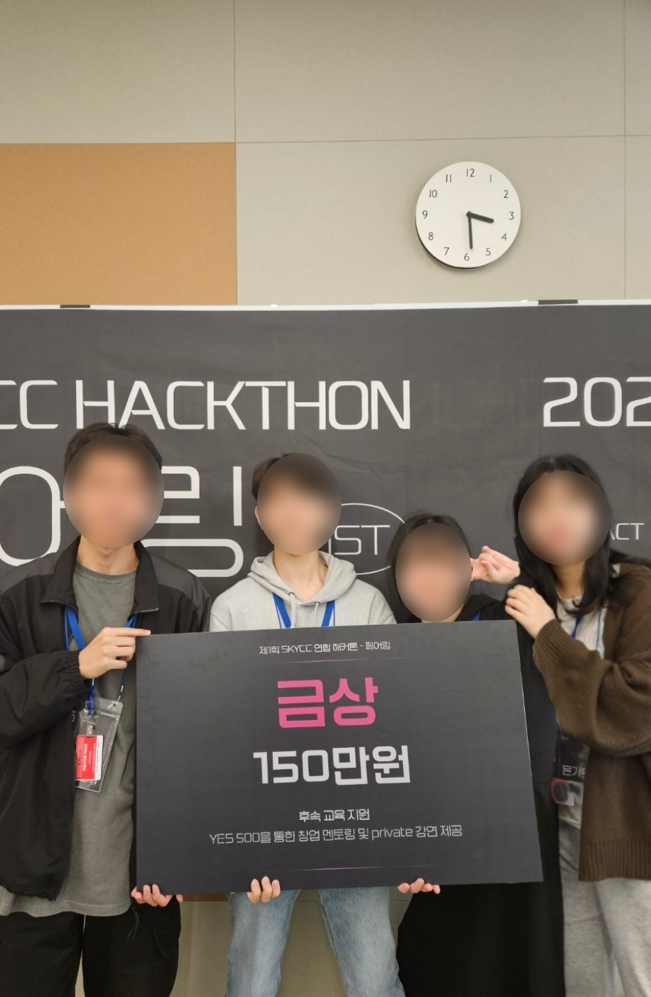 고려대학교, 서울대학교, 연세대학교의 컴퓨터 동아리들이 연합하여 주최한 제1회 SKYCC 해커톤. 동아리에서 모집글을 보고 개인참가(팀 랜덤배정)로 지원했습니다.