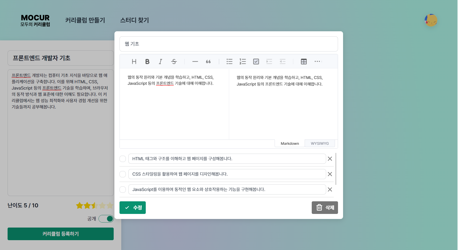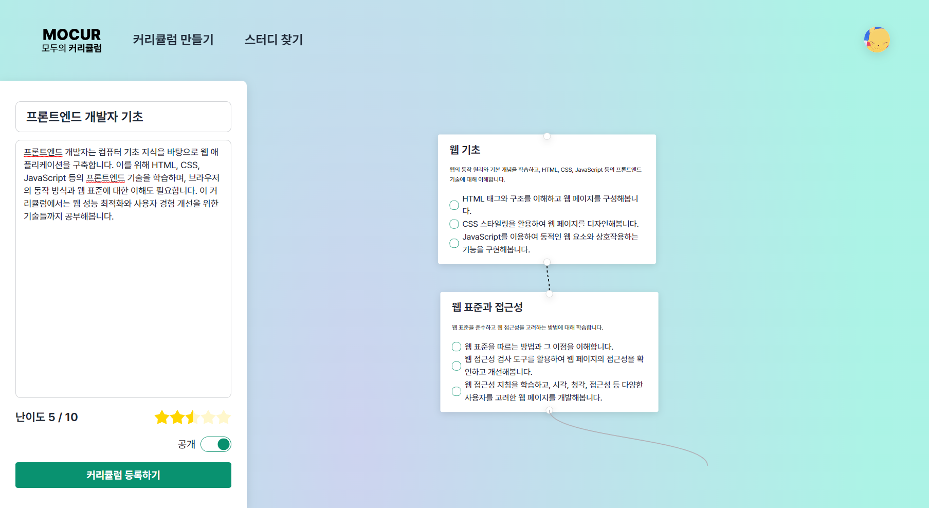 개발 시간의 대부분을 차지했던 커리큘럼 생성 화면. 기본 틀은 reactflow라는 좋은 라이브러리가 있어서 사용해보았고, 마크다운 에디터는 몇번 써 본 Toast UI를 사용했습니다.